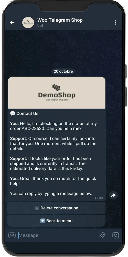 - Support client interactif : Répondez à vos clients directement depuis Telegram.